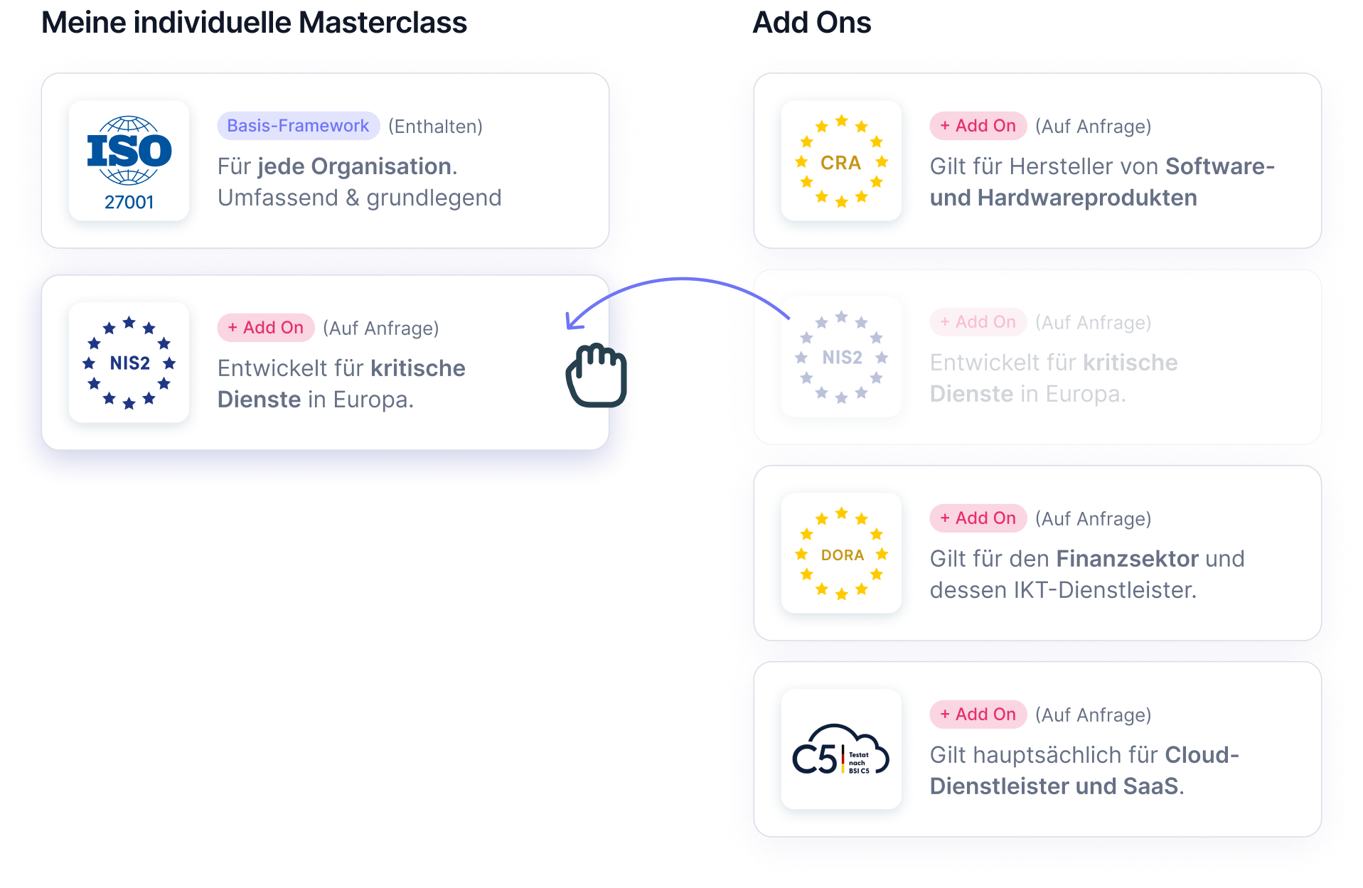 Die ISO 27001 ist das umfassendste Basis-Framework und deckt viele Anforderungen ab. Wenn ihr zusätzliche Kataloge, EU-Verordnungen oder Richtlinien berücksichtigen wollt, besprechen wir gern die passenden Möglichkeiten.